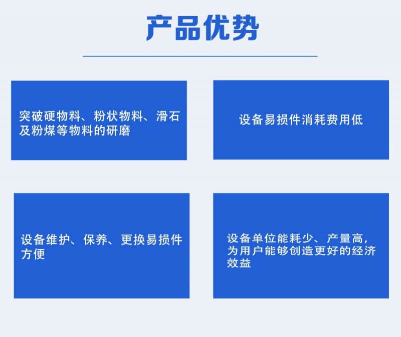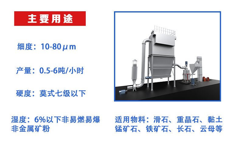 【应用领域】: 建材、化工、冶金、涂料、造纸、橡胶、医药、食品等领域湿度6%以内、莫氏硬度7级以下的非易燃易爆物料的粉磨加工